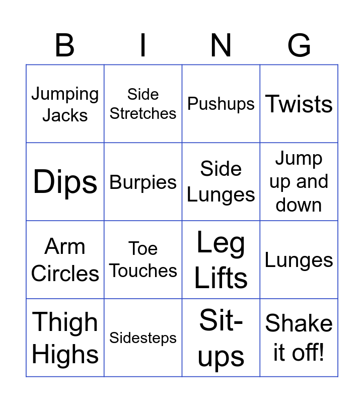 This bingo card has 16 words: Sidesteps, Lunges, Pushups, Jumping Jacks, Arm Circles, Side Stretches, Leg Lifts, Sit-ups, Dips, Burpies, Thigh Highs, Twists, Toe Touches, Jump up and down, Side Lunges and Shake it off!.