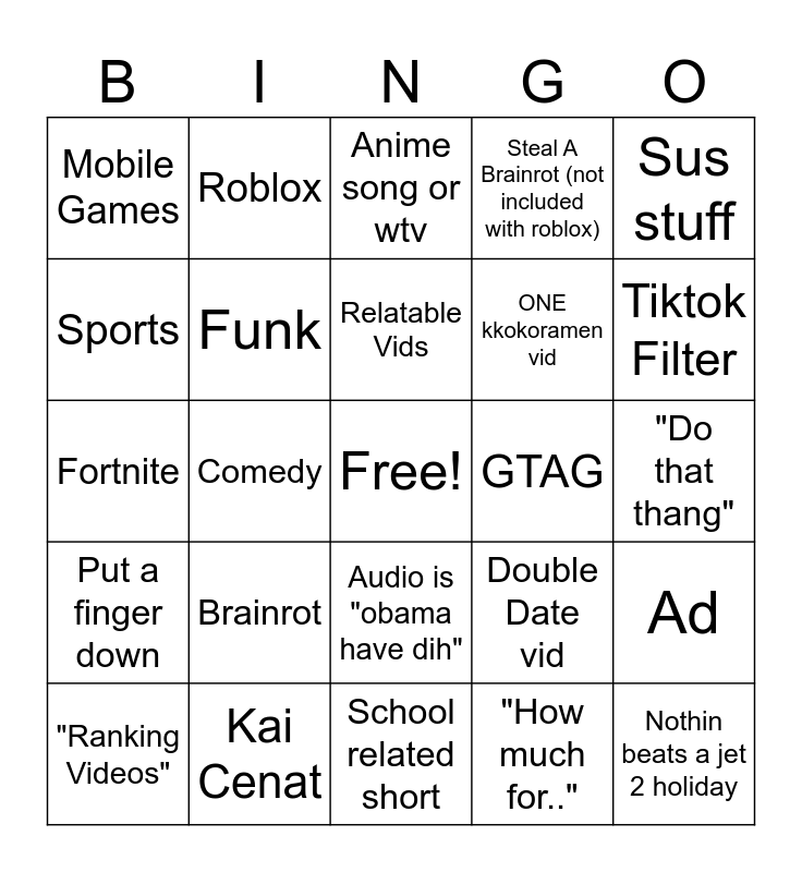 This bingo card has a free space and 24 words: Brainrot, Kai Cenat, Relatable Vids, "Ranking Videos", Sus stuff, Mobile Games, Sports, Roblox, GTAG, Audio is "obama have dih", ONE kkokoramen vid, Fortnite, Double Date vid, Ad, Funk, "How much for..", "Do that thang", Anime song or wtv, Tiktok Filter, Comedy, Nothin beats a jet 2 holiday, Put a finger down, Steal A Brainrot (not included with roblox) and School related short.