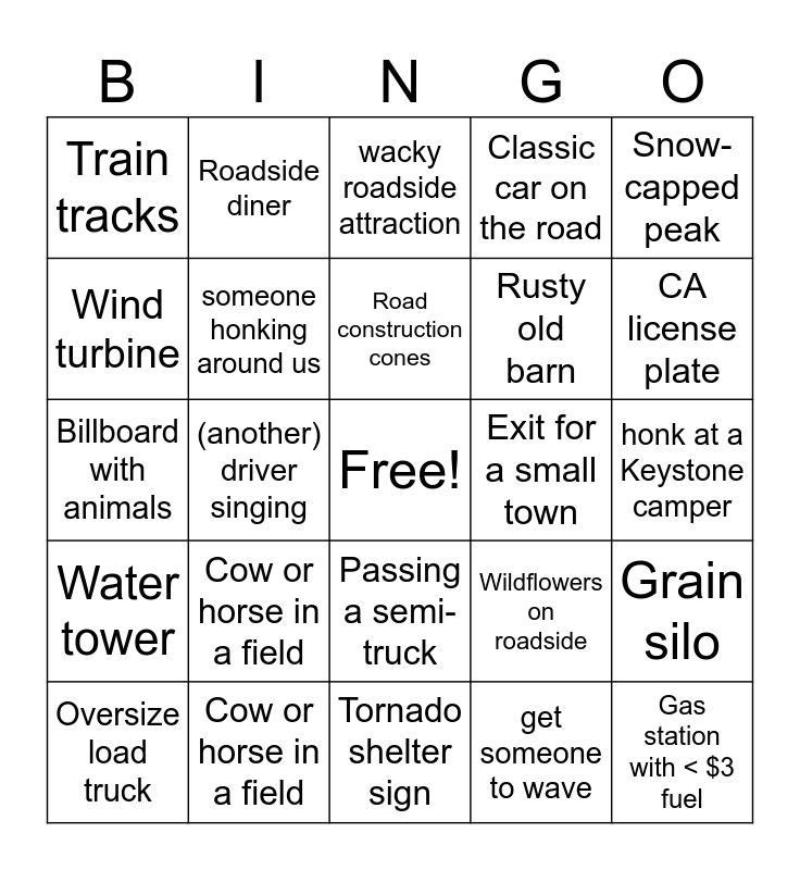 This bingo card has a free space and 24 words: Cow or horse in a field, Cow or horse in a field, Road construction cones, Oversize load truck, Snow-capped peak, Train tracks, Wind turbine, Roadside diner, Exit for a small town, Passing a semi-truck, Rusty old barn, Billboard with animals, Wildflowers on roadside, Grain silo, someone honking around us, get someone to wave, honk at a Keystone camper, wacky roadside attraction, CA license plate, (another) driver singing, Gas station with < $3 fuel, Water tower, Classic car on the road and Tornado shelter sign.