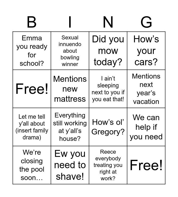 This bingo card has 16 words: Ew you need to shave!, We can help if you need, Did you mow today?, Emma you ready for school?, Let me tell y'all about (insert family drama), Sexual innuendo about bowling winner, How’s ol’ Gregory?, Reece everybody treating you right at work?, Free!, Mentions new mattress, We’re closing the pool soon…, How’s your cars?, Everything still working at y’all’s house?, Mentions next year’s vacation, I ain’t sleeping next to you if you eat that! and Free!.