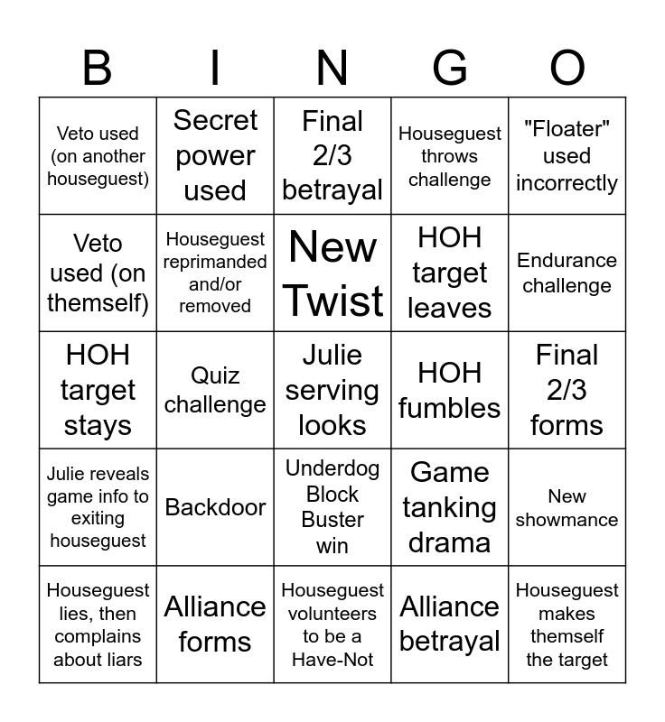 This bingo card has a free space and 24 words: Backdoor, Alliance forms, New Twist, Houseguest lies, then complains about liars, "Floater" used incorrectly, Veto used (on another houseguest), Veto used (on themself), Secret power used, HOH fumbles, Underdog Block Buster win, HOH target leaves, HOH target stays, Game tanking drama, New showmance, Houseguest reprimanded and/or removed, Alliance betrayal, Final 2/3 forms, Final 2/3 betrayal, Endurance challenge, Quiz challenge, Houseguest makes themself the target, Julie reveals game info to exiting houseguest, Houseguest throws challenge and Houseguest volunteers to be a Have-Not.