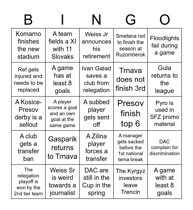 This bingo card has 26 words: A Zilina player forces a transfer, The Kyrgyz investors leave Trencin, Ivan Galad saves a club from relegation, Weiss Sr is weird towards a journalist, Floodlights fail during a game, Komarno finishes the new stadium, Ref gets injured and needs to be replaced, A team fields a XI with 11 Slovaks, Pyro is used in SFZ promo material, A manager gets sacked before the 1st national tema break, Trnava does not finish 3rd, A Kosice-Presov derby is a sellout, DAC complain for discrimination, The relegation playoff is won by the 2nd tier team, A player scores a goal and an own goal at the same game, A bizarre photo for a new signing, Smetana not to finish the season at Ruzomberok, A club gets a transfer ban, Weiss Jr announces his retirement, A subbed player gets sent off, Gula returns to the league, DAC are still in the Cup in the spring, Presov finish top 6, Gasparik returns to Trnava, A game has at least 8 goals and A game with at least 8 goals.