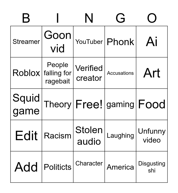 This bingo card has a free space and 24 words: Racism, Politicts, Verified creator, Add, Ai, Streamer, Roblox, Goon vid, gaming, Stolen audio, Accusations, Squid game, Laughing, Unfunny video, People falling for ragebait, America, Food, YouTuber, Art, Theory, Disgusting shi, Edit, Phonk and Character.
