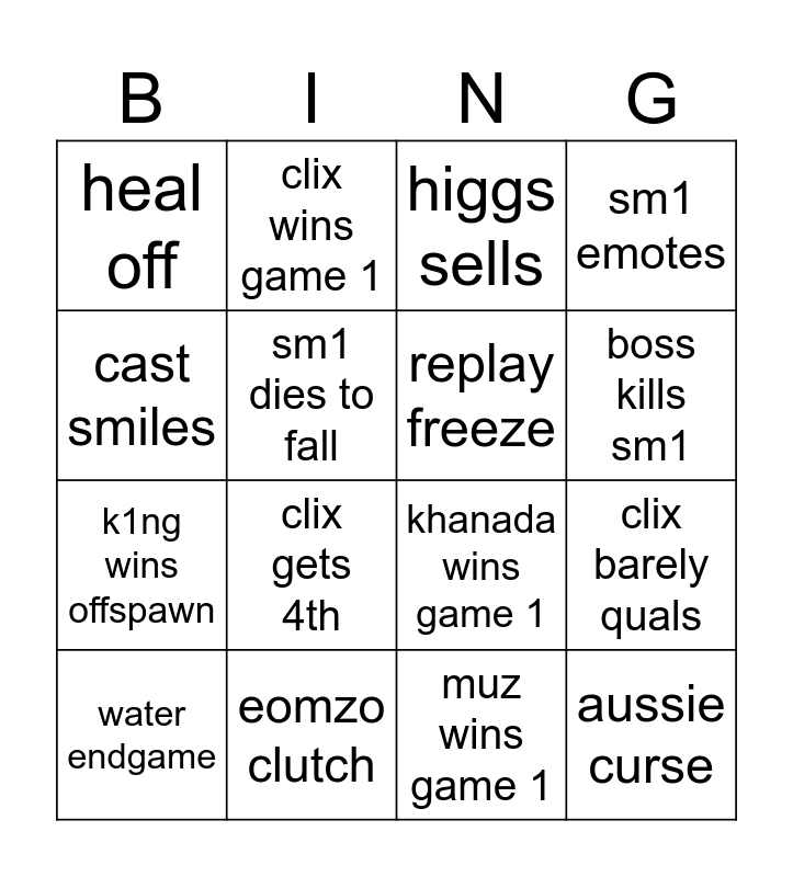 This bingo card has 16 words: eomzo clutch, clix barely quals, higgs sells, heal off, k1ng wins offspawn, clix wins game 1, khanada wins game 1, muz wins game 1, cast smiles, sm1 dies to fall, water endgame, sm1 emotes, clix gets 4th, boss kills sm1, replay freeze and aussie curse.