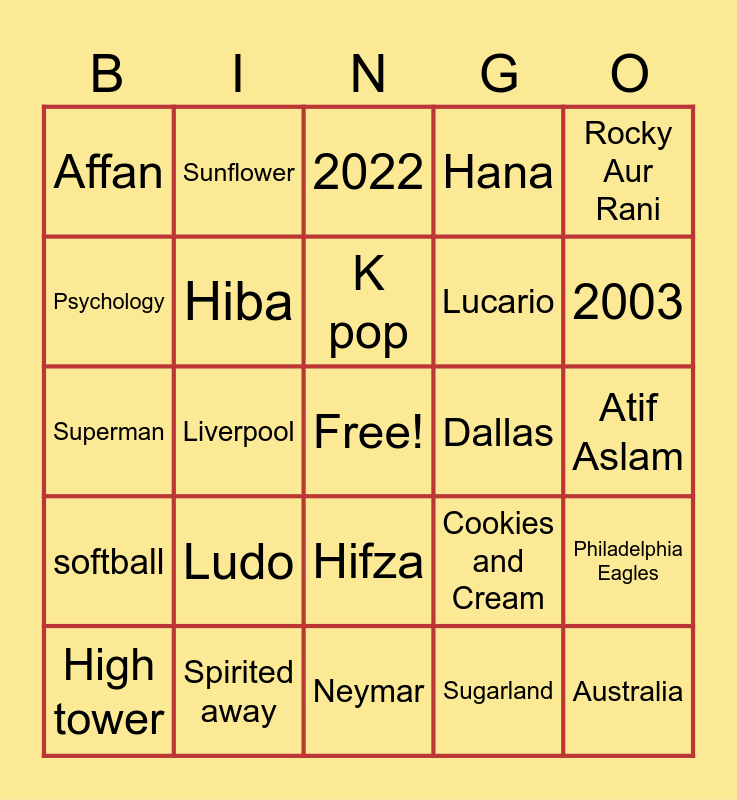 This bingo card has a free space and 35 words: University of Houston, Arsal, Huzaifah, Hiba, Hifza, Hana, Psychology, Tooth, K pop, Spiderman, Superman, Rocky Aur Rani, Pokemon, Safa, Affan, Dallas, Sugarland, Liverpool, softball, Australia, Cookies and Cream, High tower, Philadelphia Eagles, Spirited away, 2022, 2003, Dallas Mavericks, Purple, Lucario, Atif Aslam, One Direction, Neymar, Ludo, Sunflower and Ariel the Little Mermaid.