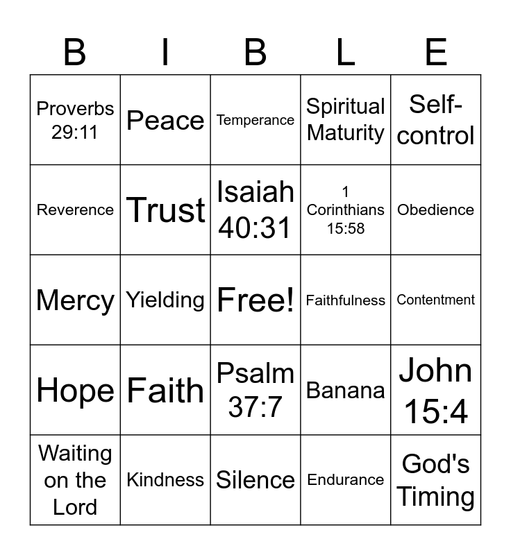 This bingo card has a free space and 34 words: Fruit of the Spirit, Endurance, Perseverance, Love, Hope, Trust, Self-control, Waiting on the Lord, Peace, Romans 12:12, Isaiah 40:31, Temperance, Gentleness, Proverbs 14:29, Faithfulness, Obedience, Kindness, Mercy, Faith, Banana, Psalm 37:7, Humility, Proverbs 29:11, Contentment, Silence, God's Timing, Spiritual Maturity, Galatians 5:22, 1 Corinthians 15:58, Reverence, Trusting God's Promises, Yielding, John 15:4 and Diligence.