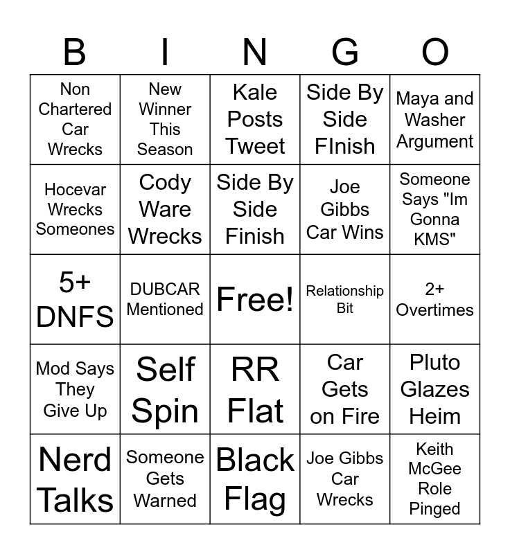 This bingo card has a free space and 86 words: RF Flat, LF Flat, RR Flat, LR Flat, Melon Complains about RFK, Go Pookie GIF used, Annoying Brainrot, Diecast Talk, 2023 Truck Series Finale Mentioned, iFiA Mentioned, @doom Said, Civicism(major Misspell), Pluto Glazes Heim, 2+ Overtimes, Caution Free Stage, Side By Side Finish, Someone Complains about the Broadcast, 5+ Cautions(including Stages), No DNF Stage, Engine Go KaBoom!, Civic Mentions he Hates Trackhouse, Post Race Fight, 5+ DNFS, Hendrick Car Wrecks, Joe Gibbs Car Wrecks, Penske Car Wrecks, RFK Car Wrecks, Message On Starboard, 10+ Skulls on Message, Someone Gets Banned, Someone Gets Warned, Someone Gets Timed Out, Car Goes in the Air, Self Spin, Hocevar Wrecks Someones, G.O.A.T Complains About Gragson, Someone Says "Im Gonna KMS", Maya Complains About Kyle Busch Wrecks, Official Server Mentioned, DUBCAR Mentioned, HAMCAR Mentioned, Zach Gets Pinged About Preece, Someone Says "SEASON STARTS NOW", Relationship Bit, Someones Internet Dies, Maya and Washer Argument, Announcement in Server Announcement, New Winner This Season, First Time Winner, Hendrick Car Wins, "h" Said in Chat, Burger Says "I Hate You All", Mod Says They Give Up, Chat Goes Off Topic, Mid Race Penalty, Pluto Threatens Violence Towards Someone, Car Loses a Tire, Joe Gibbs Car Wins, Side By Side FInish, Cody Ware Wrecks, Non Chartered Car Wrecks, BTGian at Track, Rain Delay, Red Flag, Kale Gets in Hall of Kale, Kale Posts Tweet, Kale Pings Keith McGee Role, Keith McGee Role Pinged, Corey Lajoie Role Pinged, Promoting Event, Choose Cone, Someone Leaves Mid Race, Nerd Talks, TPAR Talks, Pinned Message, Playoff Trash Talk, Black Flag, 23XI Car Wrecks, 23XI Car Wins, Civic Says "Dude", Civic Gets Pinged, Burger Gets Pinged, Bot Command Used, Car Gets Stuck in Grass, Car Gets on Fire and Green Flag Pit Stops.