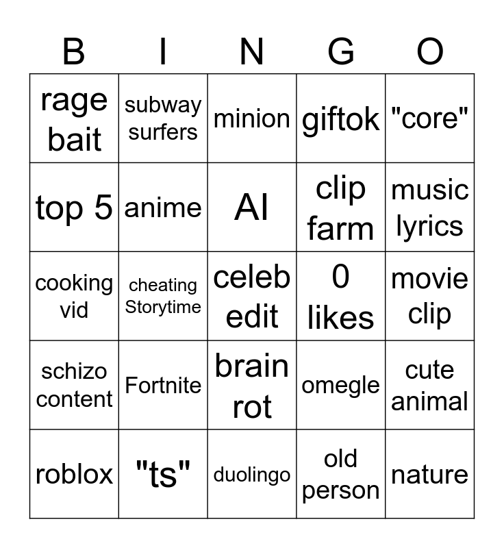 This bingo card has a free space and 24 words: Fortnite, "ts", AI, roblox, "core", rage bait, top 5, subway surfers, 0 likes, brain rot, clip farm, cooking vid, omegle, cute animal, anime, old person, movie clip, minion, music lyrics, cheating Storytime, nature, schizo content, giftok and duolingo.
