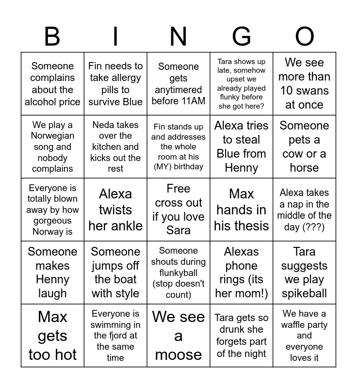 This bingo card has a free space and 31 words: We see a moose, Max complains during the city walk, Alexa twists her ankle, Someone throws up, Someone complains about the alcohol price, Someone gets anytimered before 11AM, Neda takes over the kitchen and kicks out the rest, Alexas phone rings (its her mom!), Max hands in his thesis, Tara gets so drunk she forgets part of the night, Alexa takes a nap in the middle of the day (???), We have a waffle party and everyone loves it, Sara gets an interview OR a job, We run out of hot water, Someone pets a cow or a horse, We see a deer, Tara suggests we play spikeball, Someone jumps off the boat with style, Someone makes Henny laugh, Someone shouts during flunkyball (stop doesn't count), We see more than 10 swans at once, Neda gets too cold, Max gets too hot, Fin needs to take allergy pills to survive Blue, Alexa tries to steal Blue from Henny, We play a Norwegian song and nobody complains, Tara shows up late, somehow upset we already played flunky before she got here?, Everyone is totally blown away by how gorgeous Norway is, Everyone is swimming in the fjord at the same time, Fin stands up and addresses the whole room at his (MY) birthday and Someone has at least10 flies on them.