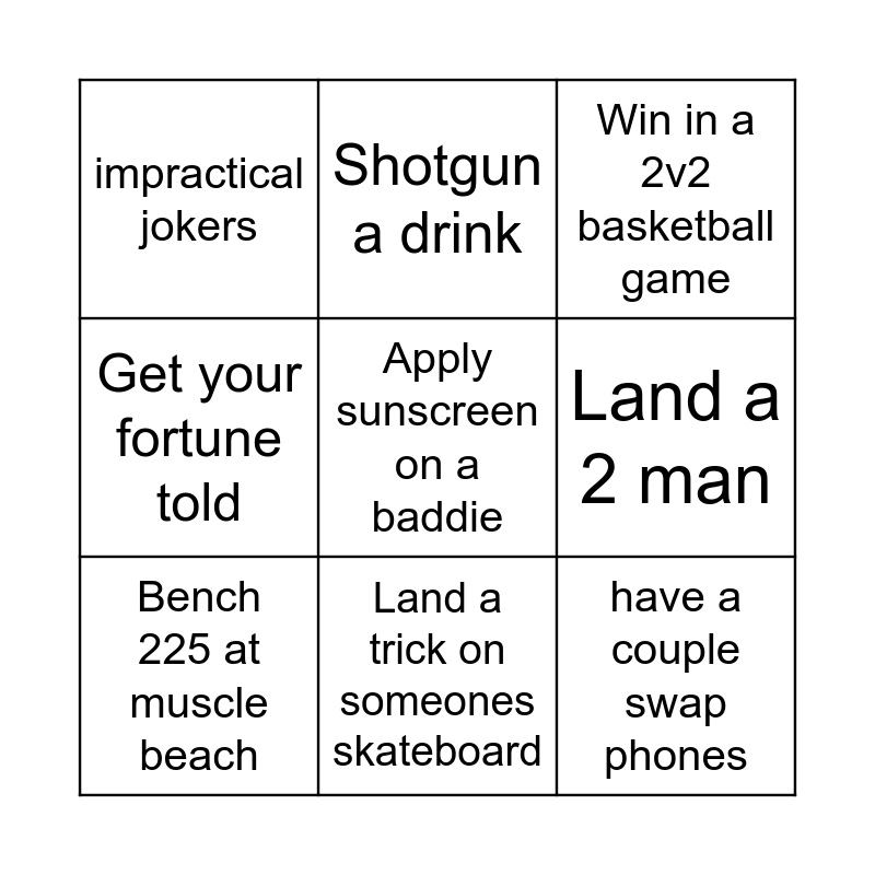 This bingo card has a free space and 8 words: Land a 2 man, Win in a 2v2 basketball game, Shotgun a drink, Bench 225 at muscle beach, impractical jokers, have a couple swap phones, Get your fortune told and Land a trick on someones skateboard.