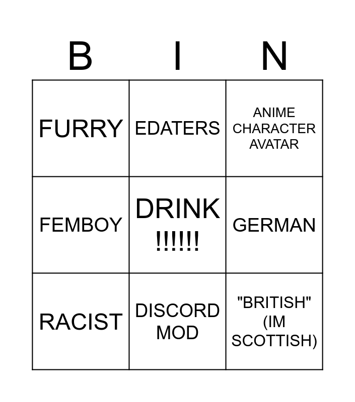 This bingo card has a free space and 8 words: GERMAN, ANIME CHARACTER AVATAR, EDATERS, RACIST, FURRY, "BRITISH"(IM SCOTTISH), FEMBOY and DISCORD MOD.