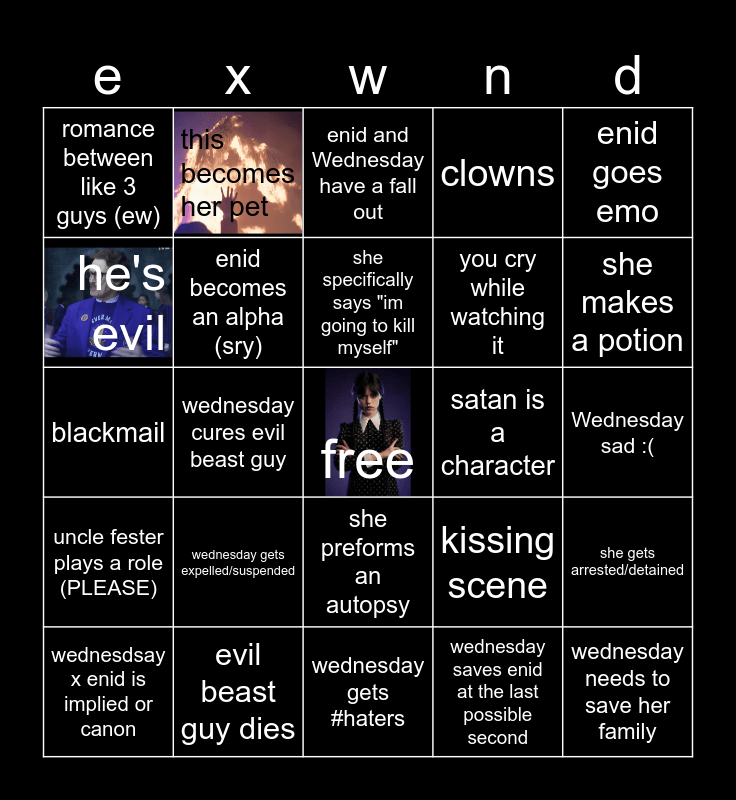 This bingo card has 2 images, a free space and 29 words: wednesdsay x enid is implied or canon, evil beast guy and wendesday get together, wednesday cures evil beast guy, the person we thought was evil is actually the good guy, romance between like 3 guys (ew), enid and Wednesday have a fall out, enid becomes an alpha (sry), wednesday gets expelled/suspended, satan is a character, evil beast guy dies, Wednesday sad :(, wednesday needs to save her family, wednesday gets #haters, wednesday saves enid at the last possible second, she makes a potion, wednesday dances to some creepy music cuz she's like that, she preforms an autopsy, uncle fester plays a role (PLEASE), enid goes emo, blackmail, kissing scene, thing legit does nothing for the story, you cry while watching it, he's evil, clowns, this becomes her pet, she gets arrested/detained, she specifically says "im going to kill myself" and reference to a social media app.
