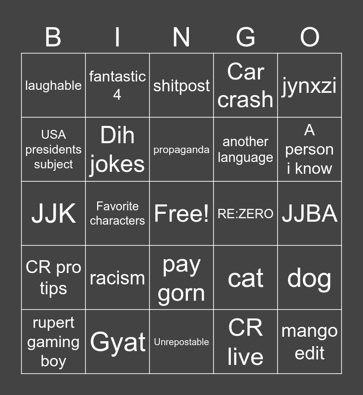 This bingo card has a free space and 24 words: rupert gaming boy, racism, propaganda, CR live, jynxzi, laughable, fantastic 4, shitpost, RE:ZERO, JJBA, JJK, Dih jokes, cat, dog, USA presidents subject, Gyat, Unrepostable, Car crash, A person i know, CR pro tips, Favorite characters, pay gorn, another language and mango edit.
