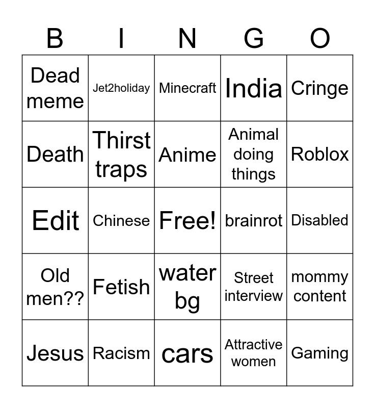 This bingo card has a free space and 24 words: Fetish, Racism, Anime, Jesus, Cringe, Dead meme, Death, Jet2holiday, brainrot, water bg, Animal doing things, Edit, Street interview, mommy content, Thirst traps, Attractive women, Disabled, Minecraft, Roblox, Chinese, Gaming, Old men??, India and cars.