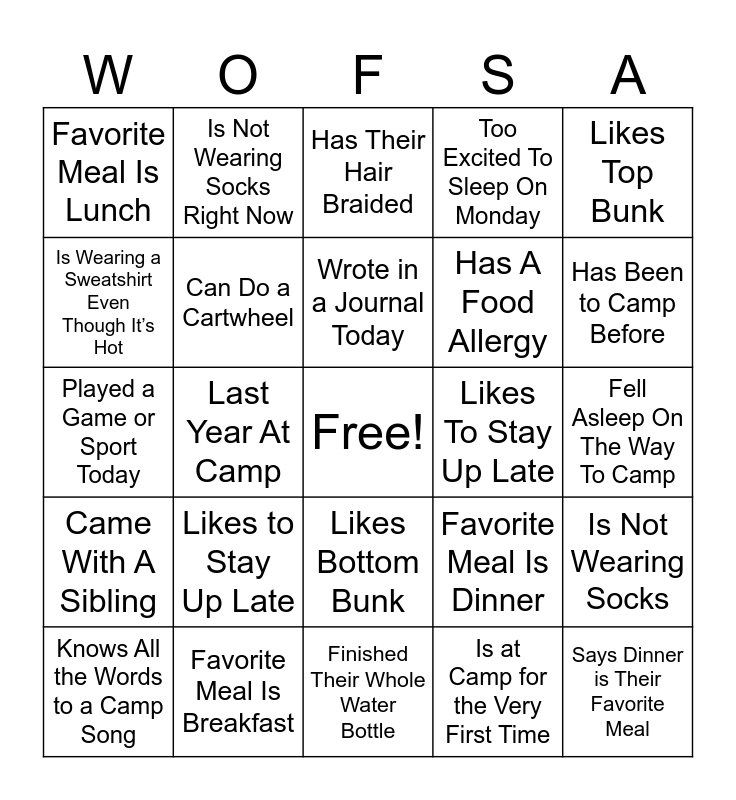 This bingo card has a free space and 69 words: Is Wearing Crocs, Fell Asleep On The Way To Camp, Has A Sibling Who Graduated CC, Likes To Wake Up Early, Favorite Meal Is Breakfast, Brought More Than One Swimsuit, Too Excited To Sleep On Monday, First Year At Camp, Likes Top Bunk, Likes Spicy Food, Is Not Wearing Socks, Is Taller Than Ms Destiny, Favorite Meal Is Lunch, Has Their Hair Braided, Brought A Blanket From Home, Last Year At Camp, Likes Bottom Bunk, Has A Food Allergy, Is Wearing A Sweatshirt, Came With A Sibling, Likes To Stay Up Late, Favorite Meal Is Dinner, Has Been to Camp Before, Told a Camp Joke Today, Ate Every SinBite at Lunch, Asked a Counselor a Deep Question, Says Breakfast is Their Favorite Meal, Was Too Excited To Sleep Last Night, Is at Camp for the Very First Time, Chose the Top Bunk, Is Not Wearing Socks Right Now, Is Taller Than Ms. Destiny, Says Lunch is Their Favorite Meal, Has Their Hair Braided Today, Brought a Blanket From Home, Says This is Their Last Year at Camp, Picked the Bottom Bunk, Has a Food Allergy, Is Wearing a Sweatshirt Even Though It’s Hot, Came With a Sibling, Likes to Stay Up Late, Says Dinner is Their Favorite Meal, Told a Joke Today, Ate Every Single Bite at Lunch, Forgot to Pack Something Important, Knows All the Words to a Camp Song, Helped Someone Unpack Today, Has Painted Nails, Made a New Friend Already, Can Do a Cartwheel, Wrote in a Journal Today, Lost Something Already, Is Wearing Tie-Dye, Finished Their Whole Water Bottle, Can Make a Friendship Bracelet, Gave Someone a Compliment This Morning, Is Afraid of Bugs, Tried a New Food at Camp, Already Loves Campfire Songs, Played a Game or Sport Today, Brushed Their Hair This Morning, Was First in Line for Breakfast, Is Wearing Their Team Color, Says They Miss Their Pet, Learned a New Camp Rule Today, Got a Letter, Card, or Surprise, Wants to Be in the Talent Show, Packed a Crazy Accessory (ask them what!) and Says They Already Want to Come Back Next Year.
