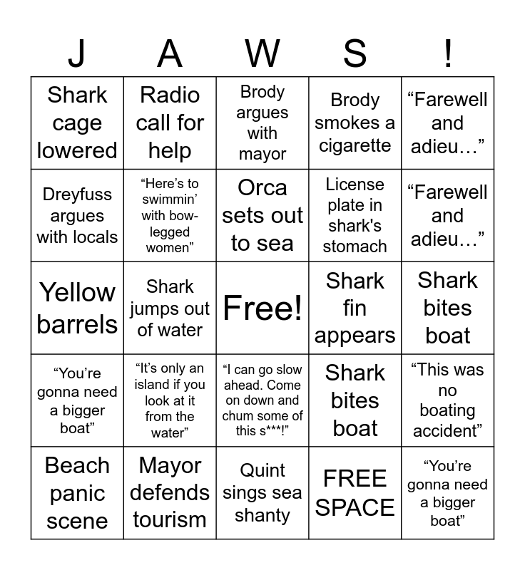 This bingo card has a free space and 30 words: Mayor defends tourism, Chum in the water, Shark jumps out of water, “Smile, you son of a…”, Shark cage lowered, Brody argues with mayor, “Here’s to swimmin’ with bow-legged women”, “I can go slow ahead. Come on down and chum some of this s***!”, Shark fin appears, Quint sings sea shanty, Shark bites boat, “You’re gonna need a bigger boat”, FREE SPACE, “It’s only an island if you look at it from the water”, “Farewell and adieu…”, Yellow barrels, Shark bites boat, “You’re gonna need a bigger boat”, “It’s only an island if you look at it from the water”, “Farewell and adieu…”, Yellow barrels, Alex Kintner's mother slaps Brody, Radio call for help, License plate in shark's stomach, Dreyfuss argues with locals, Brody smokes a cigarette, “This was no boating accident”, Beach panic scene, Orca sets out to sea and Quint scratches chalkboard.