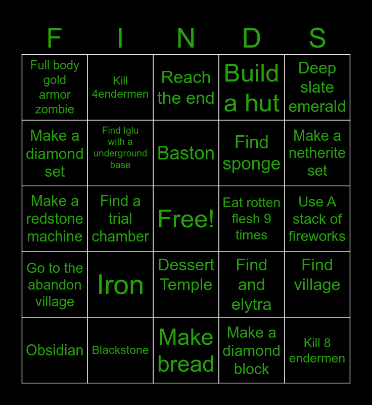 This bingo card has a free space and 24 words: Iron, Blackstone, Baston, Obsidian, Deep slate emerald, Full body gold armor zombie, Make a diamond set, Kill 4endermen, Eat rotten flesh 9 times, Dessert Temple, Find sponge, Make a redstone machine, Find and elytra, Find village, Find Iglu with a underground base, Make a diamond block, Use A stack of fireworks, Reach the end, Make a netherite set, Find a trial chamber, Kill 8 endermen, Go to the abandon village, Build a hut and Make bread.