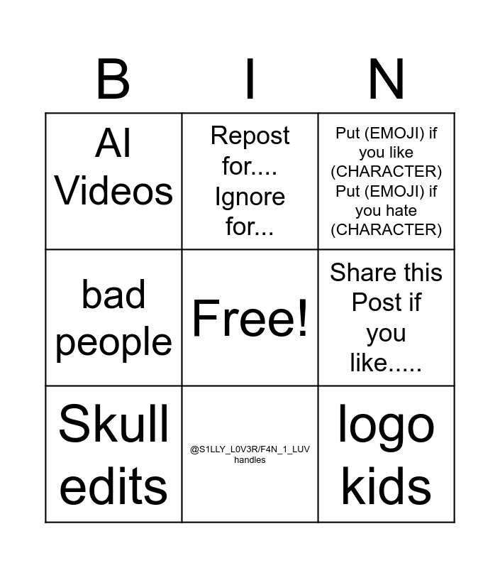 This bingo card has a free space and 8 words: Share this Post if you like....., Put (EMOJI) if you like (CHARACTER) Put (EMOJI) if you hate (CHARACTER), Repost for.... Ignore for..., Skull edits, AI Videos, logo kids, bad people and @S1LLY_L0V3R/F4N_1_LUV handles.