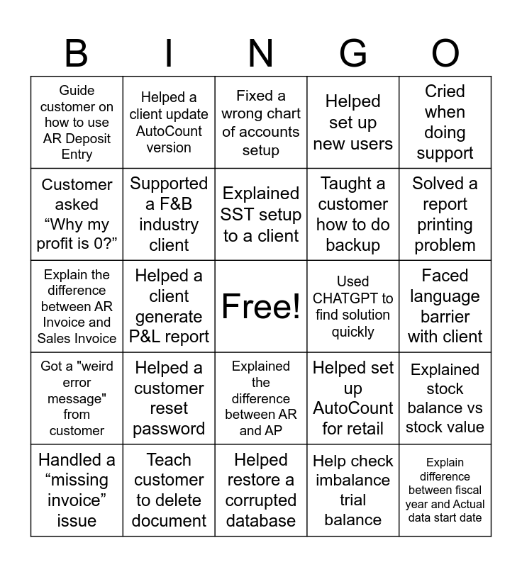 This bingo card has a free space and 25 words: Handled a “missing invoice” issue, Helped a customer reset password, Explained SST setup to a client, Help check imbalance trial balance, Solved a report printing problem, Guide customer on how to use AR Deposit Entry, Helped a client update AutoCount version, Fixed a wrong chart of accounts setup, Taught a customer how to do backup, Explained stock balance vs stock value, Explain the difference between AR Invoice and Sales Invoice, Supported a F&B industry client, Helped set up AutoCount for retail, Explain difference between fiscal year and Actual data start date, Customer asked “Why my profit is 0?”, Teach customer to delete document, Helped restore a corrupted database, Helped set up new users, Faced language barrier with client, Got a "weird error message" from customer, Helped a client generate P&L report, Explained the difference between AR and AP, Used CHATGPT to find solution quickly, Cried when doing support and Felt like an AutoCount superhero 🦸.