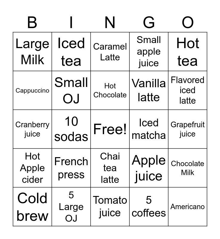 This bingo card has a free space and 24 words: French press, 5 Large OJ, Hot Chocolate, Cold brew, Hot tea, Large Milk, Cappuccino, Iced tea, Iced matcha, Chai tea latte, Vanilla latte, Cranberry juice, Apple juice, Chocolate Milk, Small OJ, 5 coffees, Grapefruit juice, Caramel Latte, Flavored iced latte, 10 sodas, Americano, Hot Apple cider, Small apple juice and Tomato juice.