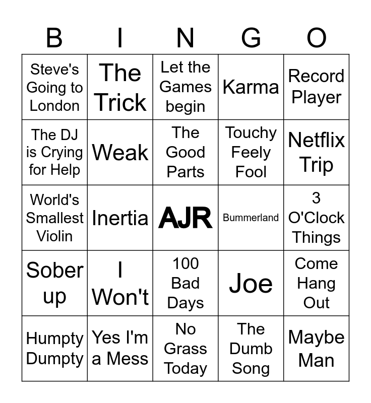 This bingo card has a free space and 40 words: Banj!, World's Smallest Violin, Burn the House Down, Weak, Yes I'm a Mess, 100 Bad Days, The Good Parts, Way Less Sad, Record Player, Sober up, Inertia, Karma, Maybe Man, 3 O'Clock Things, Bummerland, I Won't, The Lotto, Steve's Going to London, I'm Ready, Let the Games begin, Come Hang Out, The Dumb Song, Touchy Feely Fool, The DJ is Crying for Help, Don't Throw Out my Legos, Ordinaryish People, 2085, Birthday Party, Bud Like You, Drama, Hole in the Bottom of my Brain, Humpty Dumpty, I'm not famous, Joe, Netflix Trip, No Grass Today, Role Models, The Entertainment's Here, The Trick and Wow, I'm not crazy.