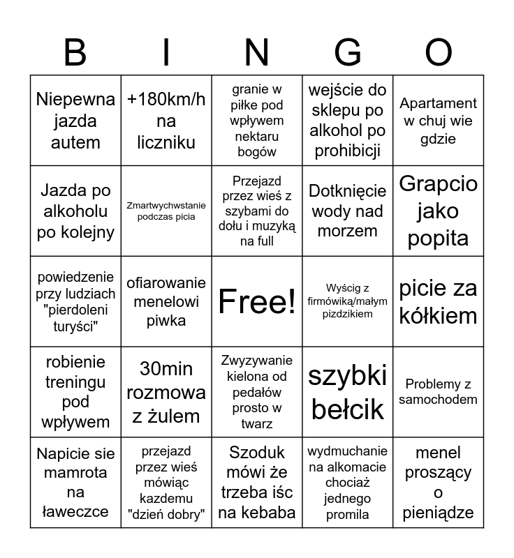 This bingo card has a free space and 24 words: 30min rozmowa z żulem, przejazd przez wieś mówiąc kazdemu "dzień dobry", Przejazd przez wieś z szybami do dołu i muzyką na full, Napicie sie mamrota na ławeczce, Apartament w chuj wie gdzie, Niepewna jazda autem, Jazda po alkoholu po kolejny, +180km/h na liczniku, Wyścig z firmówiką/małym pizdzikiem, Zwyzywanie kielona od pedałów prosto w twarz, Dotknięcie wody nad morzem, powiedzenie przy ludziach "pierdoleni turyści", szybki bełcik, Problemy z samochodem, Zmartwychwstanie podczas picia, wydmuchanie na alkomacie chociaż jednego promila, picie za kółkiem, granie w piłke pod wpływem nektaru bogów, Grapcio jako popita, ofiarowanie menelowi piwka, menel proszący o pieniądze, robienie treningu pod wpływem, wejście do sklepu po alkohol po prohibicji and Szoduk mówi że trzeba iśc na kebaba.
