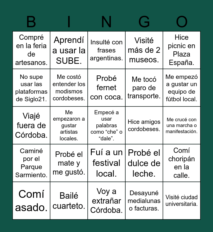 This bingo card has a free space and 24 words: Probé el mate y me gustó., Bailé cuarteto., Probé fernet con coca., Comí asado., Hice picnic en Plaza España., Compré en la feria de artesanos., No supe usar las plataformas de Siglo21., Aprendí a usar la SUBE., Hice amigos cordobeses., Fuí a un festival local., Me tocó paro de transporte., Viajé fuera de Córdoba., Probé el dulce de leche., Comí choripán en la calle., Me costó entender los modismos cordobeses., Desayuné medialunas o facturas., Me crucé con una marcha o manifestación., Insulté con frases argentinas., Me empezó a gustar un equipo de fútbol local., Me empezaron a gustar artistas locales., Visité ciudad universitaria., Caminé por el Parque Sarmiento., Visité más de 2 museos. and Voy a extrañar Córdoba..