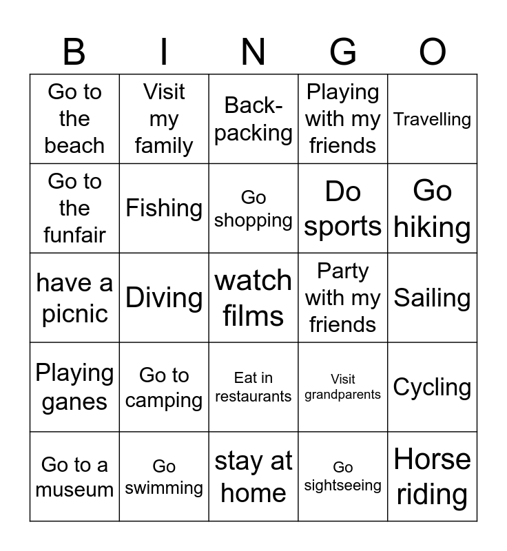 This bingo card has a free space and 24 words: Go to camping, Go swimming, Go shopping, Go to a museum, Travelling, Go to the beach, Go to the funfair, Visit my family, Party with my friends, Eat in restaurants, Do sports, have a picnic, Visit grandparents, Cycling, Fishing, Go sightseeing, Sailing, Back-packing, Go hiking, Diving, Horse riding, Playing ganes, Playing with my friends and stay at home.