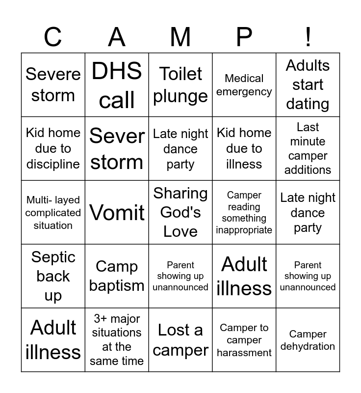 This bingo card has a free space and 33 words: All campers picked up on time, Crazy parent making life intresting, Vomit, Camper " best week of life/ summer", Septic back up, Sever storm, Adults start dating, Adult illness, DHS call, Running on schedule all day, Late night dance party, Toilet plunge, Awesome intern, Police call, Camper reading something inappropriate, Last minute camper additions, 3+ major situations at the same time, Multi- layed complicated situation, Camp baptism, Adult illness, Parent showing up unannounced, Derogatory comments that need to be addressed, Severe storm, Late night dance party, Lost a camper, Camper dehydration, Medical emergency, Kid home due to illness, Kid home due to discipline, Parent showing up unannounced, Lost control of camp, Camper to camper harassment and Bullying.