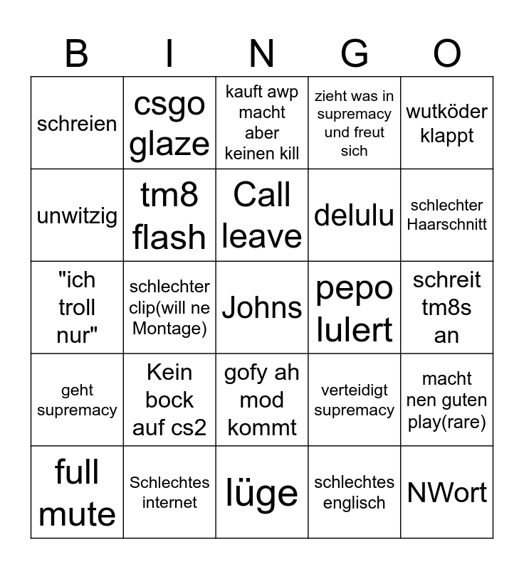 This bingo card has a free space and 24 words: Kein bock auf cs2, Schlechtes internet, Call leave, full mute, wutköder klappt, schreien, unwitzig, csgo glaze, pepo lulert, gofy ah mod kommt, delulu, "ich troll nur", verteidigt supremacy, macht nen guten play(rare), tm8 flash, schlechtes englisch, schreit tm8s an, kauft awp macht aber keinen kill, schlechter Haarschnitt, schlechter clip(will ne Montage), NWort, geht supremacy, zieht was in supremacy und freut sich and lüge.