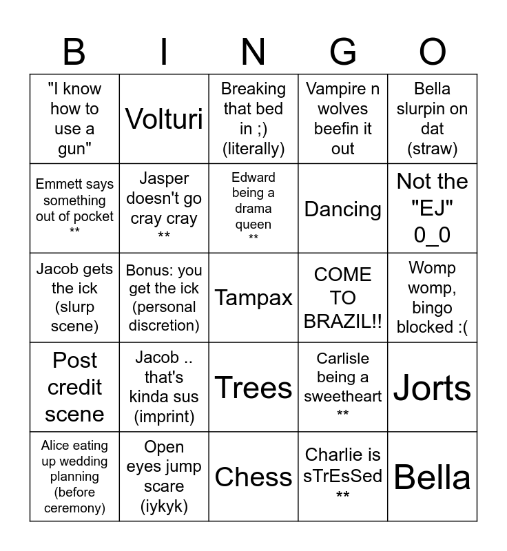 This bingo card has 43 words: Alice has a vision (we must see the actual vision), Tampax, A moment for the gorgina wedding (during ceremony), Alice eating up wedding planning (before ceremony), Baby name drop (Renesme), Charlie is sTrEsSed **, Breaking that bed in ;) (literally), Bella in heat, frfr, Bella slurpin on dat (straw), Open eyes jump scare (iykyk), Vampire n wolves beefin it out, COME TO BRAZIL!!, Trees, Jacob .. that's kinda sus (imprint), *vomits*, Chess, Reneissance face reveal (yikes), Jacob gets the ick (slurp scene), Broke the bed now she breaking her back, Not the "EJ" 0_0, Volturi, Charlie all dressed up looking cutey in a suitey, Christina Perry (A Thousand Years), "I know how to use a gun", "I'll be the one in white", Womp womp, bingo blocked :(, Charlie being a sweetheart **, Bad wig **, Carlisle being a sweetheart **, Post credit scene, Jacob says something out of pocket **, Jorts, At least four shirtless guys in one scene, Bonus: you get the ick (personal discretion), Bonus: Bella BEGS for the ice pp, Edward reading thoughts, Bella, Edward being a drama queen **, Emmett says something out of pocket **, Dancing, Alpha Jacob okurrrr, Jasper doesn't go cray cray ** and Rain.