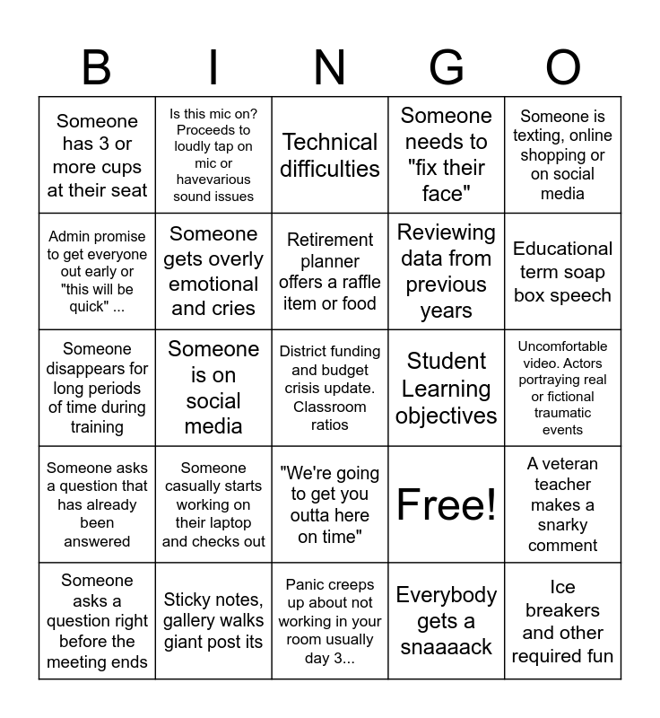 This bingo card has 25 words: Someone casually starts working on their laptop and checks out, Panic creeps up about not working in your room usually day 3..., Retirement planner offers a raffle item or food, Someone asks a question right before the meeting ends, Someone is texting, online shopping or on social media, Someone has 3 or more cups at their seat, Admin promise to get everyone out early or "this will be quick" ..., Is this mic on? Proceeds to loudly tap on mic or havevarious sound issues, Student Learning objectives, "We're going to get you outta here on time", Reviewing data from previous years, Someone disappears for long periods of time during training, Free!, A veteran teacher makes a snarky comment, Someone gets overly emotional and cries, Ice breakers and other required fun, Uncomfortable video. Actors portraying real or fictional traumatic events, Technical difficulties, Educational term soap box speech, Someone is on social media, District funding and budget crisis update. Classroom ratios, Sticky notes, gallery walks giant post its, Someone asks a question that has already been answered, Someone needs to "fix their face" and Everybody gets a snaaaack.