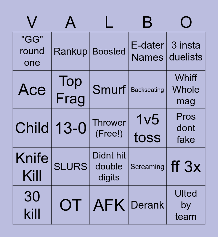 This bingo card has a free space and 38 words: Sexist, 15+ Assists, Bot Frag, Top Frag, ff 3x, SLURS, Smurf, 1v5 win :D, 3 insta duelists, Backseating, 13-0, E-dater Names, Ulted by team, Pros dont fake, Ace, Knife Kill, Pie, Boosted, 6k, 1v5 toss, "GG" round one, OT, Whiff Whole mag, 30 kill, No Coms, AFK, Remake, 4v5, Angel Numb, 9/11, 0/10, Didnt hit double digits, Derank, Rankup, Someone miss clicks ult, Screaming, Child and 4/20.