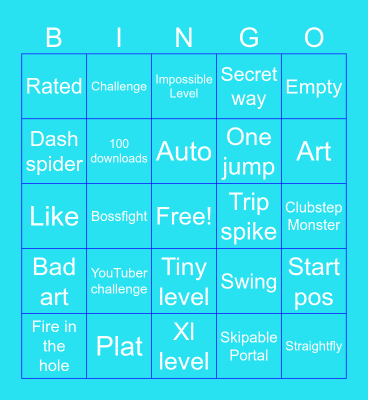 This bingo card has a free space and 24 words: Fire in the hole, YouTuber challenge, Auto, Skipable Portal, Empty, Rated, Challenge, Impossible Level, Trip spike, Clubstep Monster, Like, 100 downloads, Swing, Start pos, Dash spider, Plat, Xl level, Secret way, Art, Bad art, Bossfight, Tiny level, One jump and Straightfly.