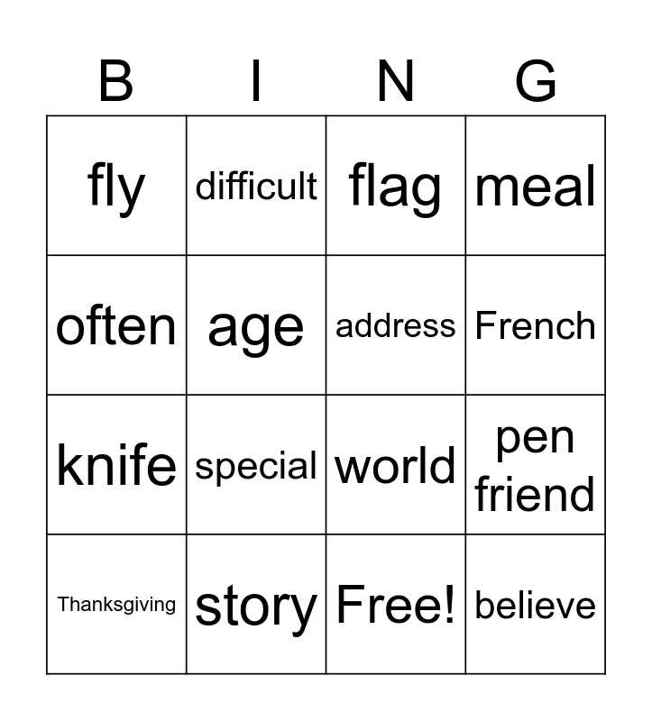 This bingo card has 17 words: Free!, Thanksgiving, flag, fly, special, meal, pen friend, address, French, age, story, world, often, difficult, knife, fork and believe.