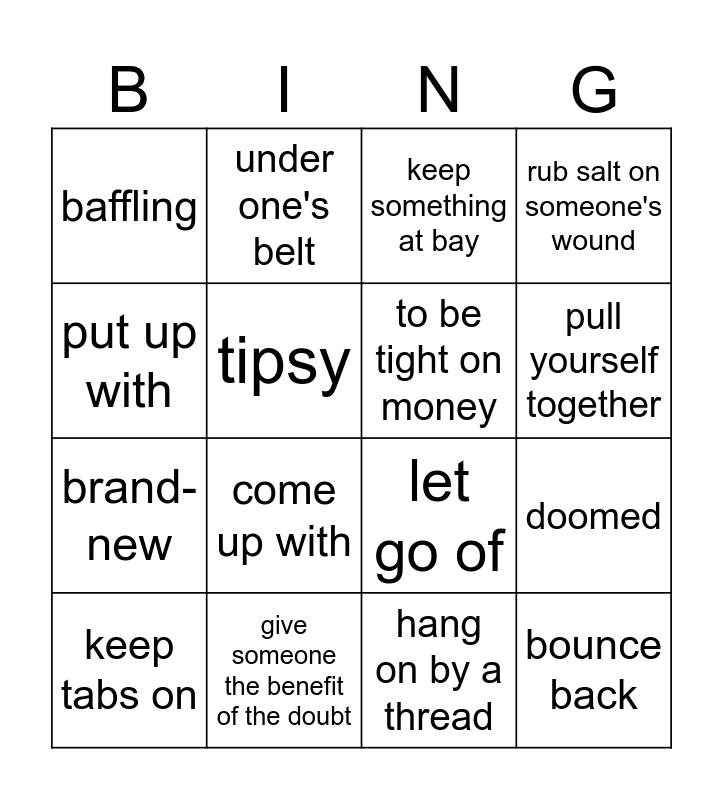This bingo card has 16 words: give someone the benefit of the doubt, doomed, keep something at bay, baffling, brand-new, under one's belt, let go of, hang on by a thread, put up with, tipsy, keep tabs on, rub salt on someone's wound, come up with, pull yourself together, to be tight on money and bounce back.