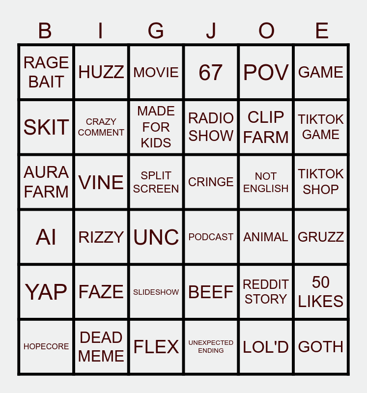 This bingo card has 36 words: AI, RIZZY, FLEX, RADIO SHOW, NOT ENGLISH, TIKTOK SHOP, RAGE BAIT, DEAD MEME, MOVIE, BEEF, CLIP FARM, GAME, YAP, VINE, MADE FOR KIDS, 67, REDDIT STORY, GRUZZ, SKIT, CRAZY COMMENT, UNC, PODCAST, ANIMAL, 50 LIKES, AURA FARM, HUZZ, SPLIT SCREEN, UNEXPECTED ENDING, POV, TIKTOK GAME, HOPECORE, FAZE, SLIDESHOW, CRINGE, LOL'D and GOTH.