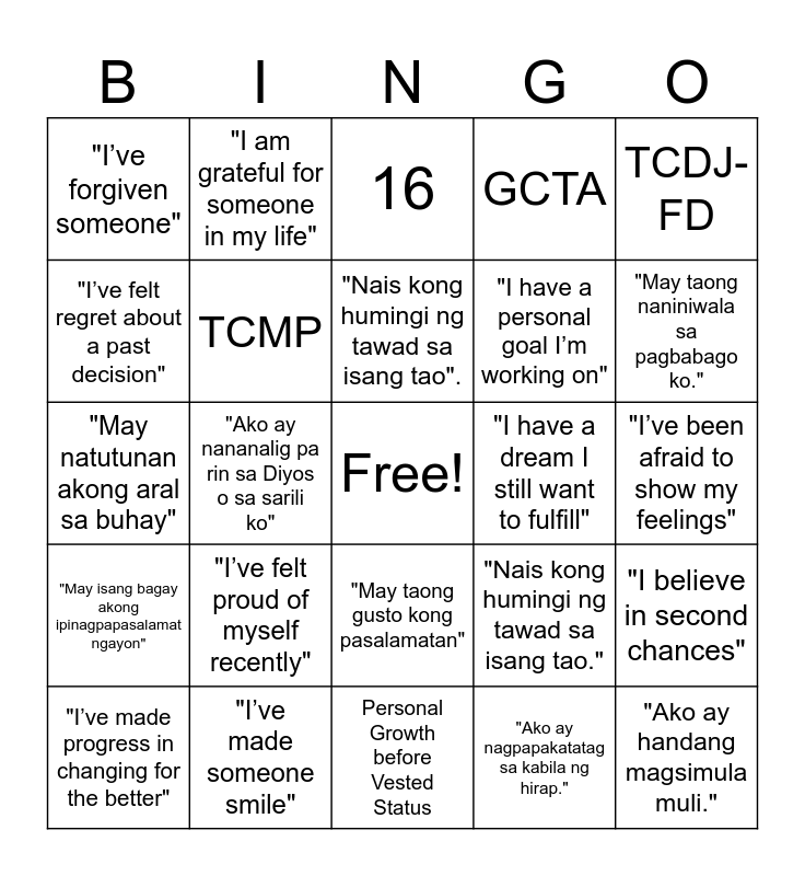 This bingo card has a free space and 24 words: "I’ve felt proud of myself recently", "I’ve made someone smile", "Nais kong humingi ng tawad sa isang tao"., "I’ve made progress in changing for the better", TCDJ-FD, "I’ve forgiven someone", "I’ve felt regret about a past decision", "I am grateful for someone in my life", "I have a dream I still want to fulfill", "May taong gusto kong pasalamatan", "I have a personal goal I’m working on", "May natutunan akong aral sa buhay", "Nais kong humingi ng tawad sa isang tao.", "I believe in second chances", TCMP, "Ako ay nagpapakatatag sa kabila ng hirap.", "I’ve been afraid to show my feelings", 16, "May taong naniniwala sa pagbabago ko.", "Ako ay nananalig pa rin sa Diyos o sa sarili ko", "Ako ay handang magsimula muli.", "May isang bagay akong ipinagpapasalamat ngayon", GCTA and Personal Growth before Vested Status.