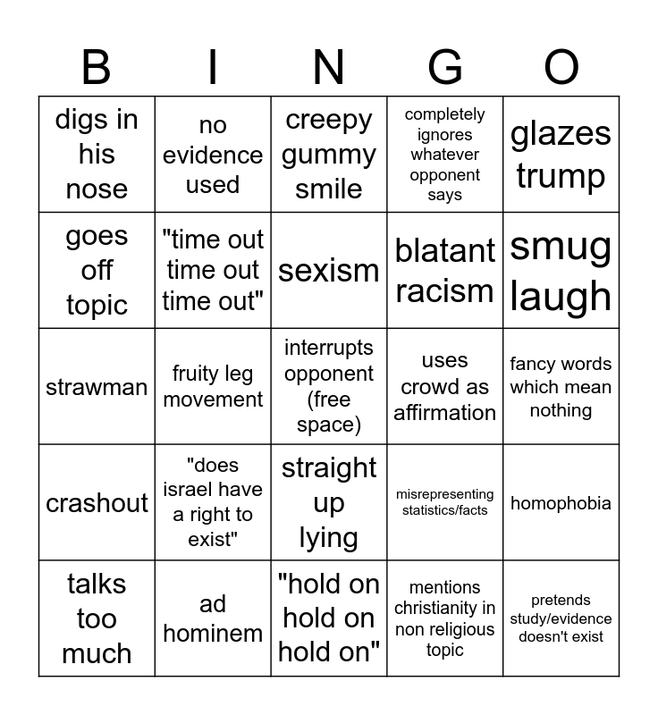 This bingo card has a free space and 24 words: "does israel have a right to exist", ad hominem, sexism, talks too much, glazes trump, digs in his nose, goes off topic, no evidence used, uses crowd as affirmation, straight up lying, blatant racism, strawman, misrepresenting statistics/facts, homophobia, "time out time out time out", mentions christianity in non religious topic, fancy words which mean nothing, creepy gummy smile, smug laugh, fruity leg movement, pretends study/evidence doesn't exist, crashout, completely ignores whatever opponent says and "hold on hold on hold on".