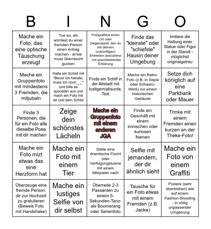 This bingo card has a free space and 24 words: Mache ein Foto mit einem Tier, Mache ein lustiges Selfie von dir selbst, Finde ein Schilf in der Altstadt mit lustigem/absurde, Text, Überzeuge eine fremde Person, dir zur Hochzeit zu gratulieren (Beweis Foto mit Handshake), Imitiere die Haltung einer Statue oder Figur in der Standt - möglichst originalgetreu, Mache ein Foto, das eine optische Täuschung erzeugt, Mache ein Gruppenfoto mit mindestens 3 Fremden, die mitjubeln, Tue so, als würdest du einer fremden Person einen Antrag machen - er/sie muss überrascht gucken, Finde ein Geschäft mit einem ironischen oder kuriosen Namen, Stelle eine dramtische Flucht oder Verfolgungsszene mit einem Mitspieler nach, Mache ein Retro-Foto (z.B. in Sepia oder Schwarz-Weiß) vor einem historischen Gebäude, Finde 3 Personen, die für ein Foto alle dieselbe Pose mit dir machen, Selfie mit jemandem, der dir ähnlich sieht, Mache ein Foto von einem Graffiti, Halte ein Schild mit "Bevor ich heirate, muss ich noch___" und fülle es sponatan aus und mach ein Foto mit dir und dem Schild, Tausche für ein Foto etwas mit einem Fremden (z.B. Jacke), Trinke mit einem Fremden einen kurzen an der Theke-Foto!, Fotografiere einen Ort oder Gegenstand, den du mit deinem (zukünftigen) Eheleben assoziierst . mit anschließdnder Erklärung, Setze dich königlich auf eine Parkbank oder Mauer, Zeige dein schönstes Lächeln, Posiere (sehr übertrieben) wie auf einem Fashion-Shooting - in völlig unpassender Umgebung, Mache ein Foto mizt etwas das eine Herzform hat, Finde das "kleinste" oder "schiefste" Hausin deiner Umgebung and Überrede 2-3 Passanten zu einem 5-Sekunden-Tanz- als Boomerang oder Serienfoto.