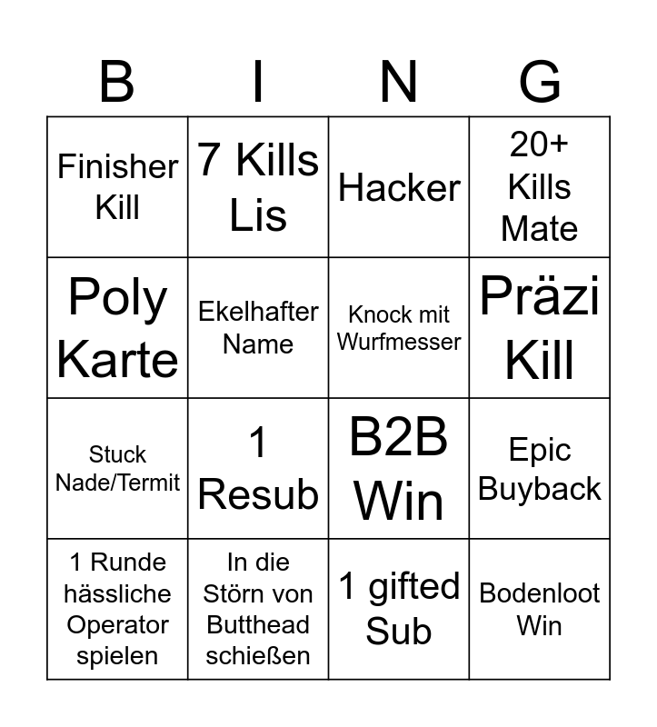 This bingo card has 16 words: In die StΓΆrn von Butthead schieΓen, Epic Buyback, Hacker, Finisher Kill, Stuck Nade/Termit, 7 Kills Lis, B2B Win, 1 gifted Sub, Poly Karte, Ekelhafter Name, 1 Runde hΓ€ssliche Operator spielen, 20+ Kills Mate, 1 Resub, PrΓ€zi Kill, Knock mit Wurfmesser and Bodenloot Win.