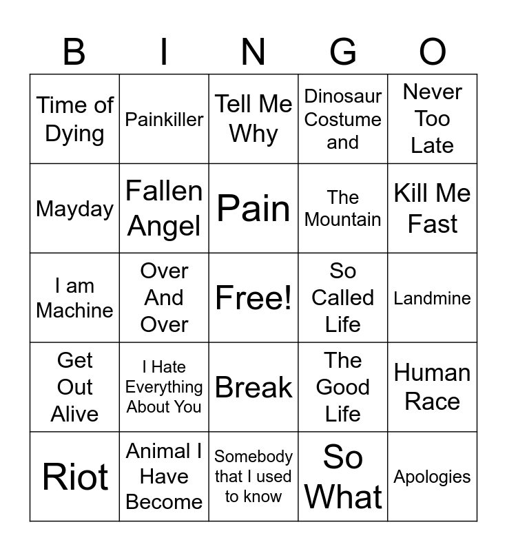 This bingo card has a free space and 24 words: I Hate Everything About You, Animal I Have Become, Pain, Riot, Never Too Late, Time of Dying, Mayday, Painkiller, So Called Life, Break, The Mountain, I am Machine, The Good Life, Human Race, Fallen Angel, So What, Landmine, Tell Me Why, Kill Me Fast, Over And Over, Apologies, Get Out Alive, Dinosaur Costume and and Somebody that I used to know.