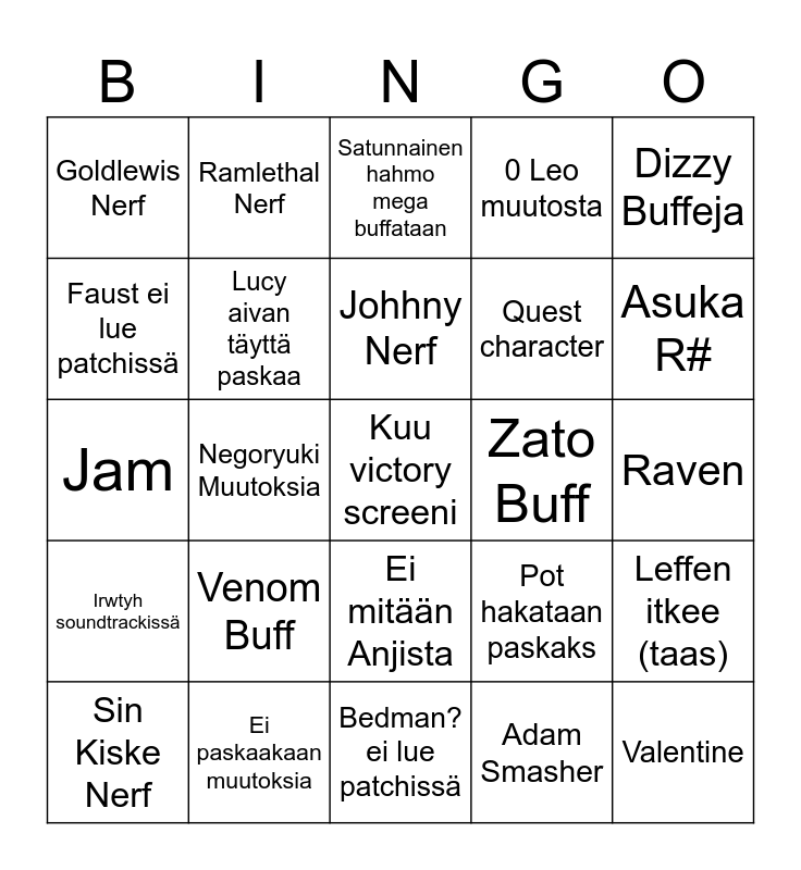 This bingo card has 25 words: Venom Buff, Bedman? ei lue patchissä, Johhny Nerf, Sin Kiske Nerf, Dizzy Buffeja, Goldlewis Nerf, Faust ei lue patchissä, Ramlethal Nerf, Zato Buff, Ei mitään Anjista, Quest character, Jam, Pot hakataan paskaks, Leffen itkee (taas), Lucy aivan täyttä paskaa, Valentine, Raven, Satunnainen hahmo mega buffataan, Asuka R#, Negoryuki Muutoksia, Kuu victory screeni, Ei paskaakaan muutoksia, Irwtyh soundtrackissä, 0 Leo muutosta and Adam Smasher.