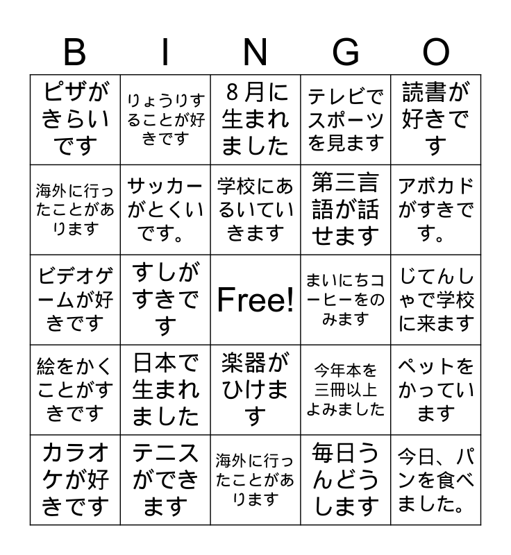 This bingo card has a free space and 24 words: 日本で生まれました, テニスができます, 学校にあるいていきます, カラオケが好きです, 読書が好きです, ピザがきらいです, 海外に行ったことがあります, りょうりすることが好きです, まいにちコーヒーをのみます, 楽器がひけます, 第三言語が話せます, ビデオゲームが好きです, 今年本を 三冊以上 よみました, ペットをかっています, サッカーがとくいです。, 毎日うんどうします, じてんしゃで学校に来ます, 8月に生まれました, アボカドがすきです。, すしがすきです, 今日、パンを食べました。, 絵をかくことがすきです, テレビでスポーツを見ます and 海外に行ったことがあります.