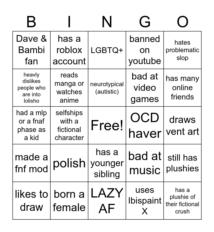 This bingo card has a free space and 24 words: polish, born a female, neurotypical (autistic), likes to draw, hates problematic slop, Dave & Bambi fan, heavly dislikes people who are into lolisho, has a roblox account, OCD haver, has a younger sibling, bad at video games, had a mlp or a fnaf phase as a kid, bad at music, still has plushies, reads manga or watches anime, uses Ibispaint X, draws vent art, LGBTQ+, has many online friends, selfships with a fictional character, has a plushie of their fictional crush, made a fnf mod, banned on youtube and LAZY AF.