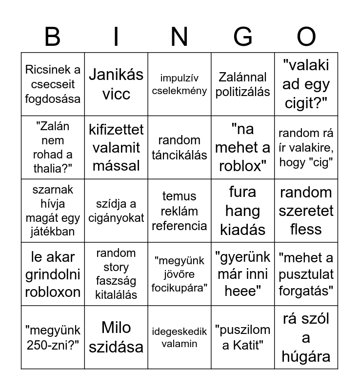 This bingo card has a free space and 24 words: random story faszság kitalálás, Milo szidása, random táncikálás, "megyünk 250-zni?", "valaki ad egy cigit?", Ricsinek a csecseit fogdosása, "Zalán nem rohad a thalia?", Janikás vicc, fura hang kiadás, "megyünk jövőre focikupára", "na mehet a roblox", szarnak hívja magát egy játékban, "gyerünk már inni heee", "mehet a pusztulat forgatás", kifizettet valamit mással, "puszilom a Katit", random szeretet fless, impulzív cselekmény, random rá ír valakire, hogy "cig", szídja a cigányokat, rá szól a húgára, le akar grindolni robloxon, Zalánnal politizálás and idegeskedik valamin.