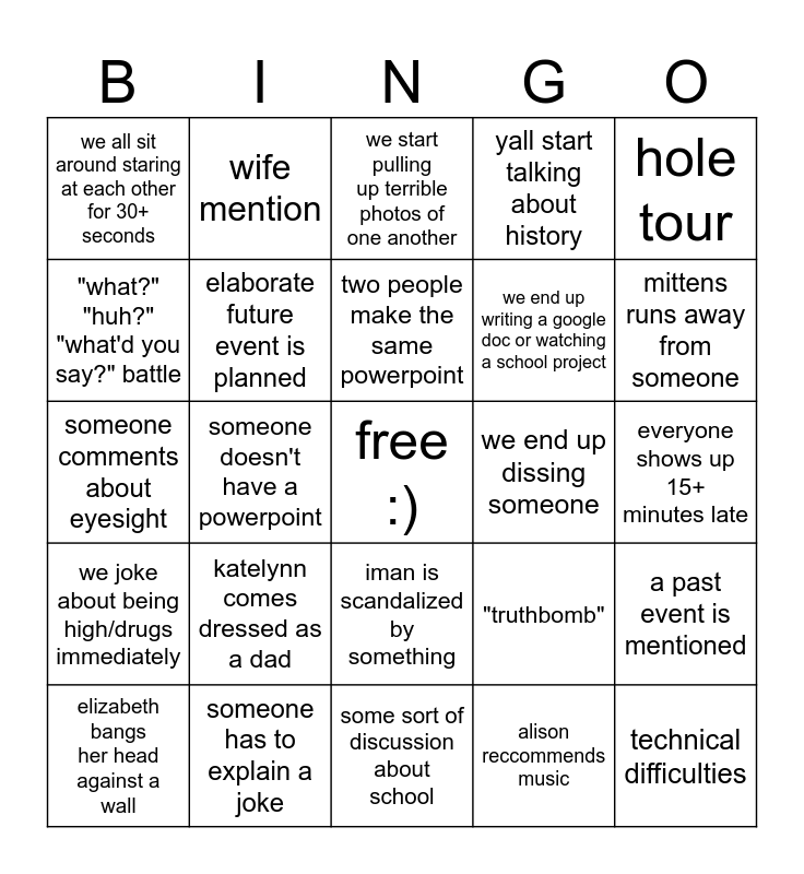 This bingo card has a free space and 24 words: katelynn comes dressed as a dad, someone has to explain a joke, two people make the same powerpoint, elizabeth bangs her head against a wall, hole tour, we all sit around staring at each other for 30+ seconds, "what?" "huh?" "what'd you say?" battle, wife mention, we end up dissing someone, iman is scandalized by something, we end up writing a google doc or watching a school project, someone comments about eyesight, "truthbomb", a past event is mentioned, elaborate future event is planned, alison reccommends music, everyone shows up 15+ minutes late, we start pulling up terrible photos of one another, mittens runs away from someone, someone doesn't have a powerpoint, technical difficulties, we joke about being high/drugs immediately, yall start talking about history and some sort of discussion about school.