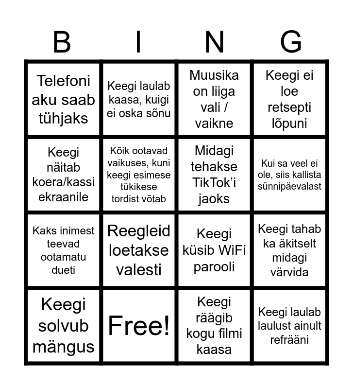 This bingo card has 22 words: Free!, Keegi ajab joogi ümber, Keegi laulab kaasa, kuigi ei oska sõnu, Keegi teeb pilti toidust, Kõik ootavad vaikuses, kuni keegi esimese tükikese tordist võtab, Midagi tehakse TikTok’i jaoks, Telefoni aku saab tühjaks, Muusika on liiga vali / vaikne, Keegi küsib WiFi parooli, Keegi laulab laulust ainult refrääni, Kaks inimest teevad ootamatu dueti, Keegi ei loe retsepti lõpuni, Köök näeb välja nagu sõjatsoon, Keegi ütleb: “Ma juba olen seda näinud”, Keegi räägib kogu filmi kaasa, Värv läheb natuke… mujale kui plaanis, Keegi tahab ka äkitselt midagi värvida, Keegi solvub mängus, Reegleid loetakse valesti, Keegi näitab koera/kassi ekraanile, Kui sa veel ei ole, siis kallista sünnipäevalast and Tasuta ruut! Aga tee kõigile high-five!.