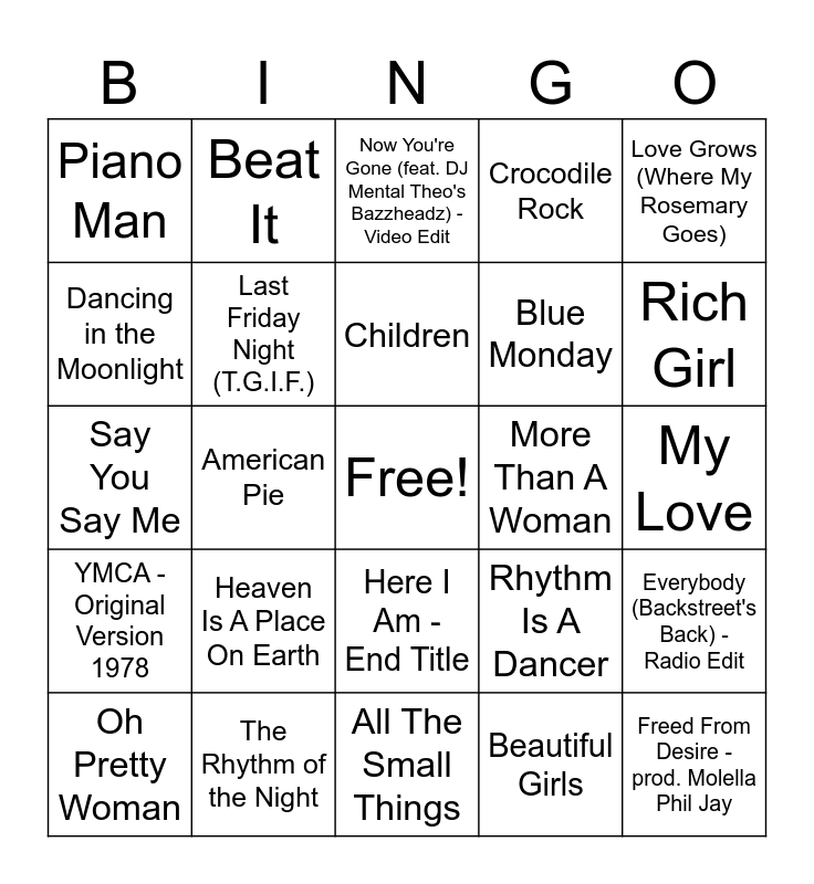 This bingo card has a free space and 92 words: Stereo Love - Edit, I Will Survive, All The Small Things, You Can't Hurry Love, To Love Somebody, Every Breath You Take, Livin' On A Prayer, Oh Pretty Woman, Le Freak, Night Changes, Girls Just Want to Have Fun, Miss Independent, Billie Jean, Blue Monday, Smooth Operator - Single Version, Love Grows (Where My Rosemary Goes), Now You're Gone (feat. DJ Mental Theo's Bazzheadz) - Video Edit, Detroit Rock City, DJ Got Us Fallin' In Love (feat. Pitbull), Born in the U.S.A., Party Rock Anthem, U Can't Touch This, Like a Prayer, Running Up That Hill (A Deal With God), Heaven Is A Place On Earth, Last Friday Night (T.G.I.F.), Year 3000, California Dreamin' - Single Version, Gimme! Gimme! Gimme! (A Man After Midnight), The Final Countdown, The Rhythm of the Night, Here I Am - End Title, I Love It (feat. Charli XCX), Temperature, Beat It, L'Amour Toujours, Empire State Of Mind, I Gotta Feeling, Children, Rhythm Is A Dancer, Say You Say Me, YMCA - Original Version 1978, My Love, Hallini, Freed From Desire - prod. Molella Phil Jay, Give Me Everything (feat. Nayer), Lady - Hear Me Tonight, Daddy Cool, Dynamite, The Winner Takes It All, Don't Stop Believin', Sweet Dreams (Are Made of This) - 2005 Remaster, Sarà perché ti amo, Here Comes The Sun - Remastered 2009, I Want It That Way, Can't Help Falling in Love, Rehab, Dancing in the Moonlight, Promiscuous, American Pie, The Power of Love, I Like To Move It, Wavin' Flag - Coca-Cola® Celebration Mix, Some Nights, Cotton Eye Joe, Beautiful Girls, Theme From New York New York - 2008 Remastered, Where Is The Love?, Desire - ESC 2000, I'm Coming Out, My Humps, Sweet Child O' Mine, Crocodile Rock, Jessie's Girl, I Will Always Love You, Bella Ciao, Everybody (Backstreet's Back) - Radio Edit, Sweet Caroline, One More Time, Time After Time, Dirty Cash (Money Talks), More Than A Woman, Piano Man, ...Baby One More Time, Vodka - ESC 2008, Euphoria, My Girl, Magic, Believe, Material Girl, Rich Girl and Price Tag.