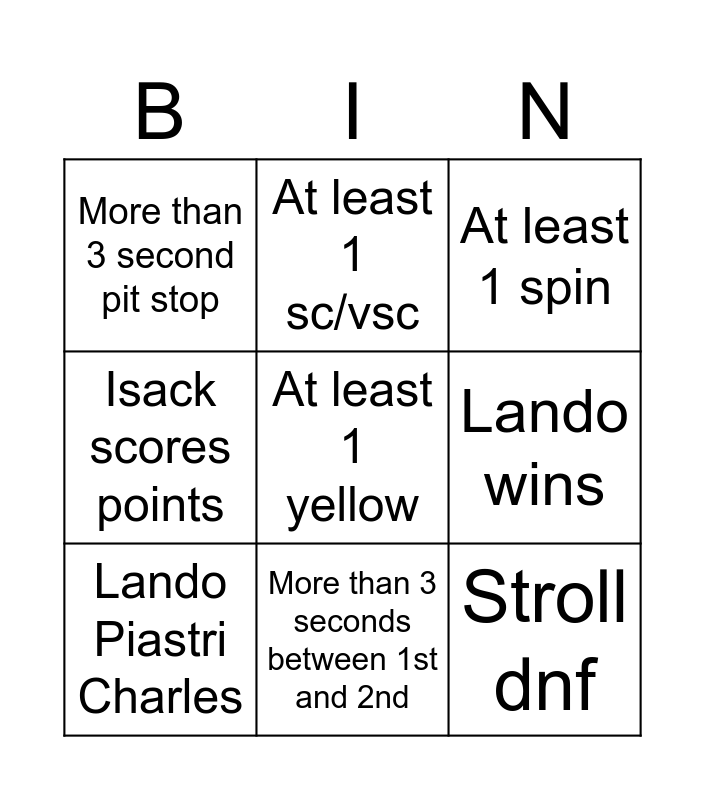 This bingo card has a free space and 8 words: Lando wins, At least 1 spin, At least 1 sc/vsc, Lando Piastri Charles, More than 3 second pit stop, Stroll dnf, Isack scores points and More than 3 seconds between 1st and 2nd.